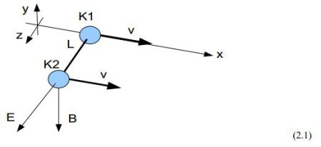 Wir gehen wieder davon aus, dass die Punktladung K1 seit unendlich langer Zeit fest im Ursprung des ungestrichenen Bezugssystems verankert sei, die Punktladung K2 nimmt auch wieder in z-Richtung den Abstand L ein.