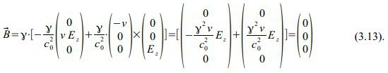 und weiters berücksichtigt, dass uz‚ zur Raumzeit des Startereignisses gleich Null ist, so erhält man nach kurzer Rechnung die gestrichene Lorentz-Kraft, die wieder nur eine z‘-Komponente hat: