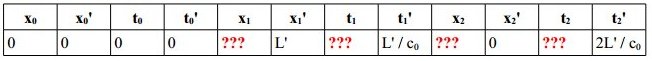 Da wir die Länge L‘ des Raumschiffes und die Geschwindigkeit des Lichtblitzes c0 kennen, können wir alle gestrichenen Größen leicht berechnen: