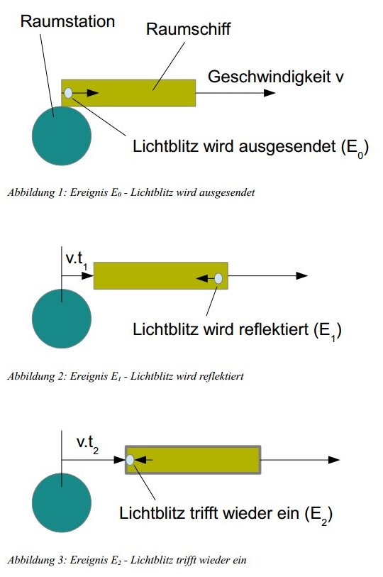Im Raumschiff wird gerade ein wissenschaftliches Experiment durchgeführt. Und zwar wird ein Lichtblitz vom hinteren Ende des Raumschiffs durch eine Vakuumröhre zum vorderen Ende gesendet und dort an einem Spiegel reflektiert. Die Laufzeit des Lichtblitzes wird gemessen, und zwar für den Hinweg und für den Rückweg.