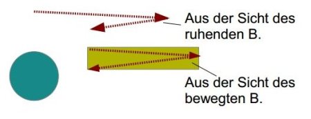 Wenn nun das Licht immer gleich schnell ist, dann kommen wir in Bedrängnis mit unserem Begriff der Gleichzeitigkeit, denn im bewegten System vergeht für Hin-und Rückweg sicherlich dieselbe Zeit, während im ruhenden System der Hinweg länger dauert als der Rückweg.