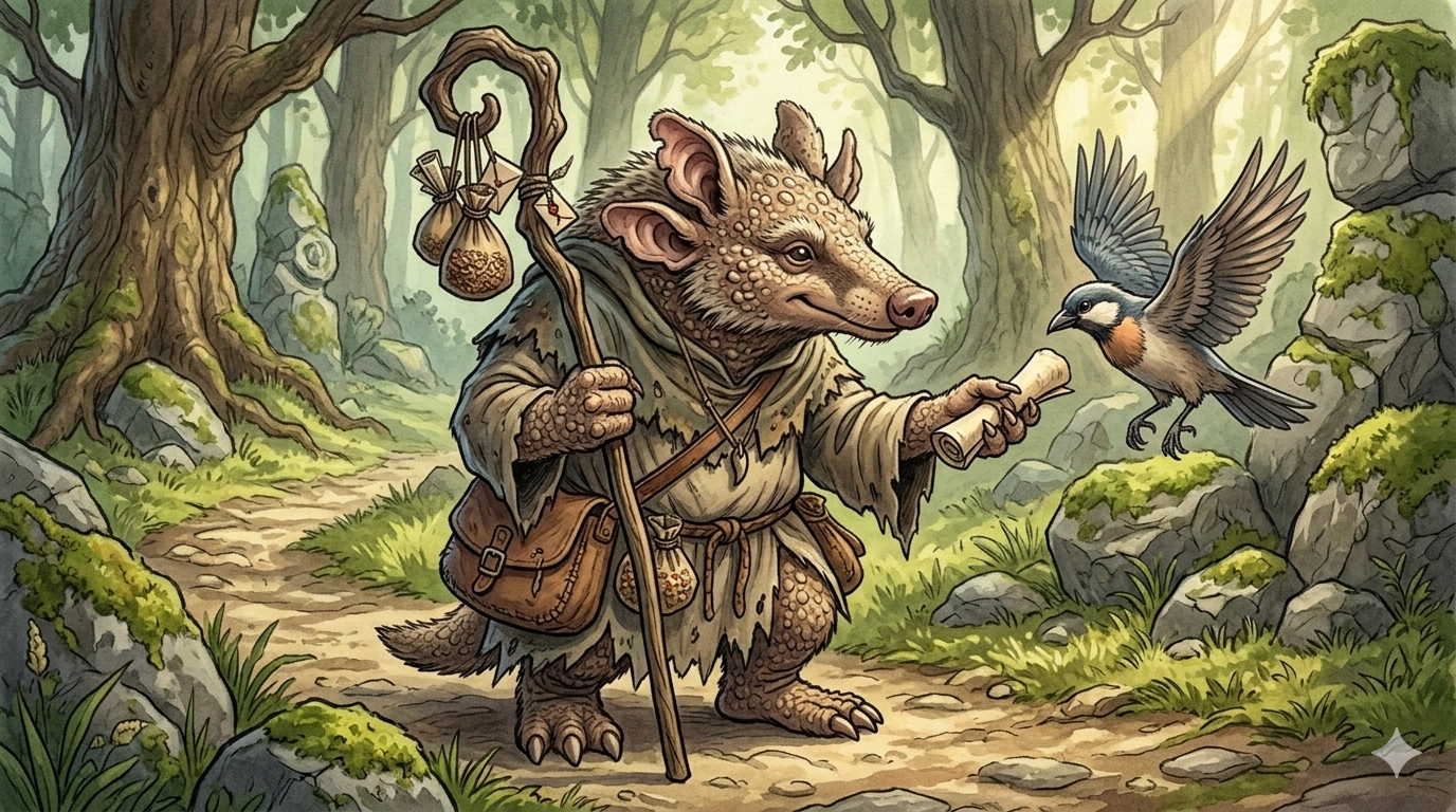 Wie gefällt dir denn die Interpretation des Granupostels auf dem Bild? Wenn er anders aussehen soll – zum Beispiel weniger wie ein Gürteltier-Bote und mehr wie ein mechanisches Wesen – sag einfach Bescheid!