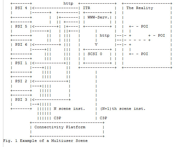 In MR mode, a multiuser session consists of one, several or many personal scene instances and a server/controller scene instance, allowing the users to collaborate in a scene, which has been downloaded from the WWW server.
