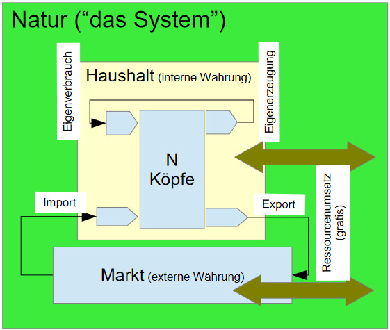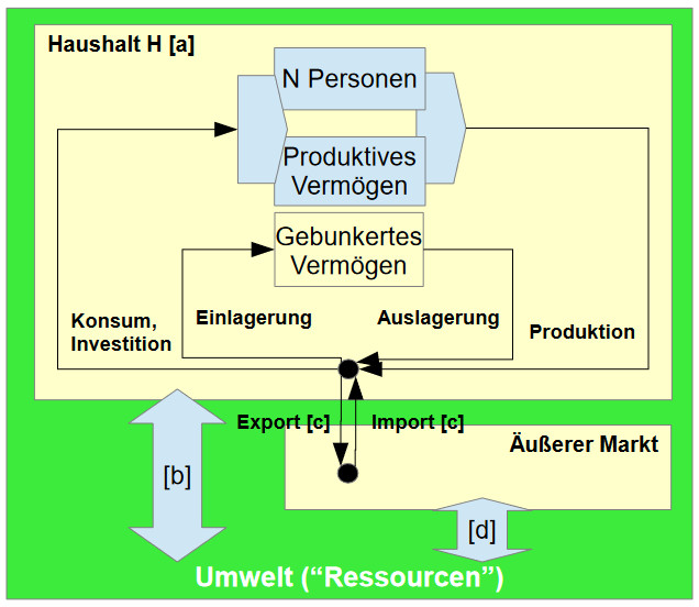 Nun, der Haushalt produziert, konsumiert und lebt ja einerseits innerhalb der „eigenen Mauern“ – den dafür benötigten Ressourcenumsatz für Produktion und Konsum würde ich in dem oberen braunen Pfeil sehen.